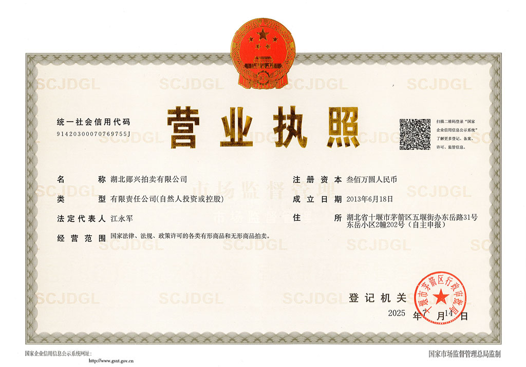 湖北鄖興拍賣有限公司是經(jīng)湖北省拍賣業(yè)主管部門批準,在湖北省工商行政管理部門注冊,具有法人資格的綜合性一級拍賣企業(yè)。