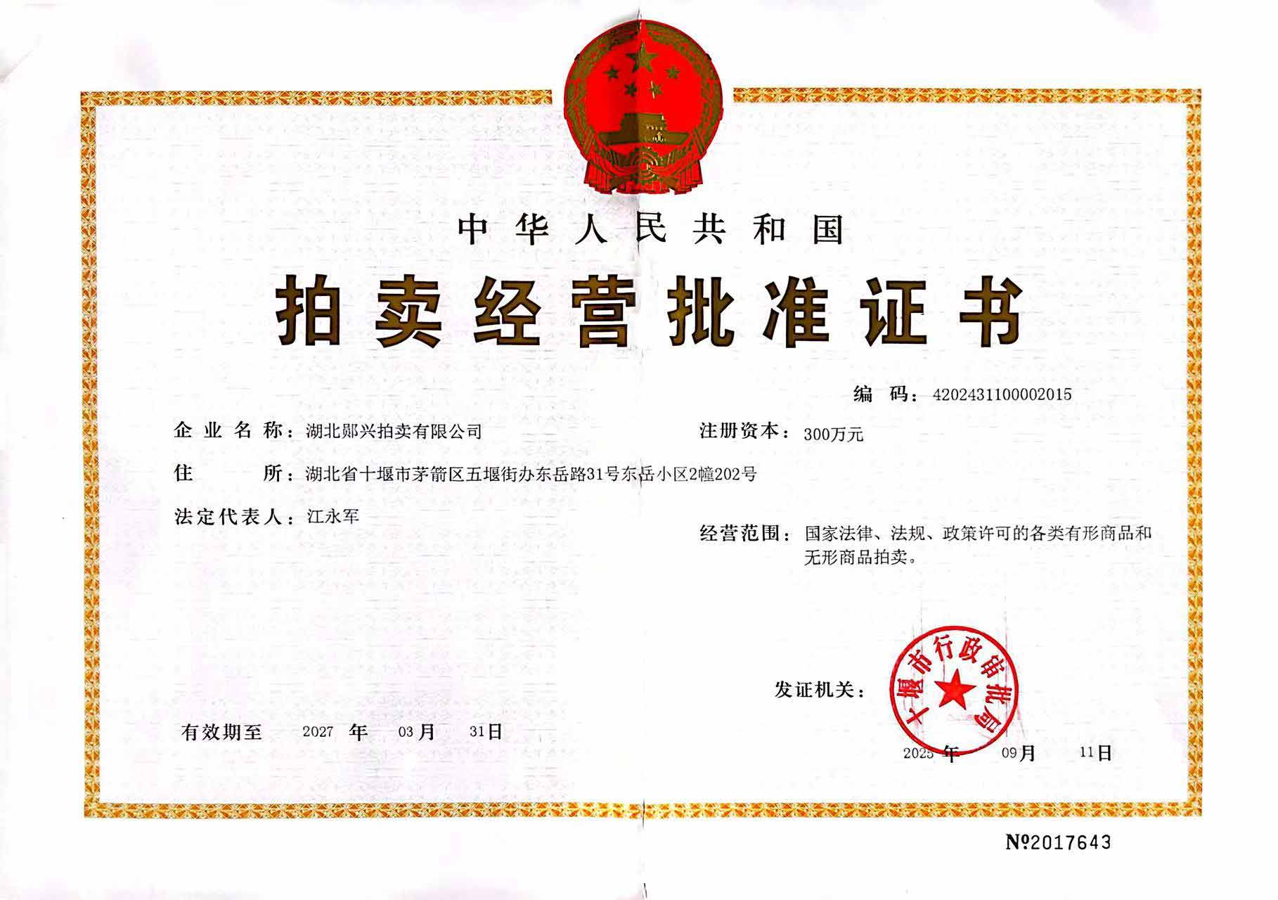 公司于2014年9月12日取得湖北省商務廳頒發(fā)的拍賣經(jīng)營批準證書(證號4202431100002014),10月22日取得十堰市工商局頒發(fā)的營業(yè)執(zhí)照(證號91420300070769755J),公司注冊資本300萬元,注冊地址位于湖北省十堰市茅箭區(qū)東岳路31號,法人代表江永軍。